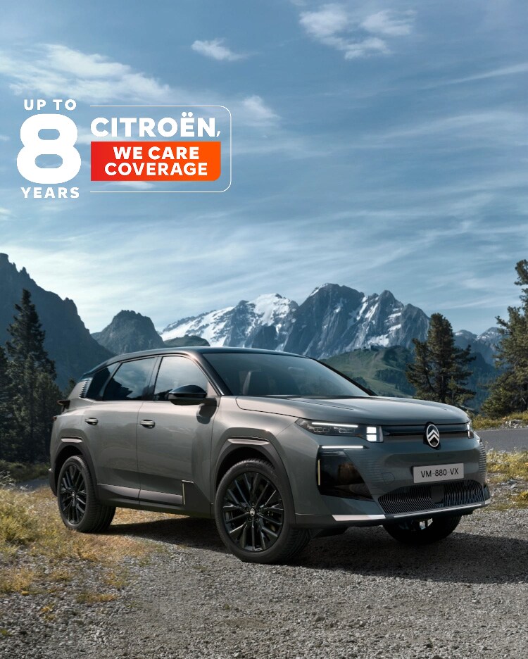 - Citroën We Care warranty, offering a 6-year extended warranty with special coverage after the standard manufacturer warranty expires. Activated when servicing is carried out within the authorized Citroën network in line with the recommended maintenance schedule, it remains valid until the next service appointment, up to a maximum of 8 years or 160,000 km. This unique service covers essential components such as the engine, gearbox, transmission, and drivetrain, for all new vehicles registered from January 10, 2025. Citroën We Care reflects Citroën’s commitment to quality and reliability.